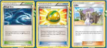 训练师卡是用于辅助场上精灵战斗的卡牌,主要功能包括抽牌、削减对手手牌、为己方精灵提供增益效果或对敌方精灵施加减益效果。训练师卡分为三类:场地卡、道具卡和支援卡。其中,支援卡因其效果强大,每回合只能使用一张。图中最右侧的卡牌即为支援卡,其效果是抽取6张手牌,若在己方第一回合使用,则可抽取8张手牌。场地卡在场上最多只能存在一张,但可以通过打出新的场地卡替换原有的场地。图中左侧的卡牌是场地卡,效果是为己方每只电系或水系精灵恢复30点HP。道具卡与支援卡类似,每回合使用数量不限。图中中间的卡牌是道具卡,效果是装备给己方精灵后,每次受到攻击时可以抽取两张手牌。