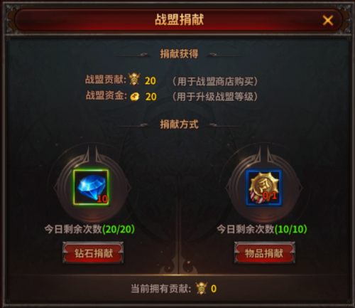 战盟成员每日可以进行战盟捐献,获取战盟贡献和战盟资金。分为[钻石捐献]和[物品捐献]两种