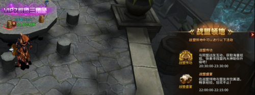 战盟领地为一个新的场景,[战盟盛宴]、[战盟传功]活动在战盟领地中进行