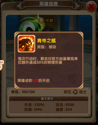 英雄伤害较高,没有明显的肉盾,青龙云长被动是低于30%血量时无敌两个回合,利用这个被动在前面站住,抵挡敌方打前排的技能和普通攻击,哪吒可通过首充获得,配合村之女神打全体aoe,基德负责收割