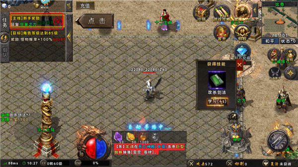 4、钻石商城可购买隐身、开天斩、逐日剑法、十步一杀,有了这些,刷怪、PK打架何惧也!上来就嘎嘎乱杀。