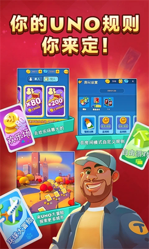 还记得那些货架上令人心动的专属卡吗?他们化身各种规则卡,让你随意组合并命名属于自己的规则体系,在免费的房间模式中使用。试想一下,把小丑牌、反弹牌、连续+2+4、换牌、强制出牌等全部合在一起,是怎样的神奇乐趣。再也不怕你家的村规在游戏里找不到了!另外,你还可以用聚会模式,大家一起输入四位数密码,迅速展开一场欢乐的UNO趴!
