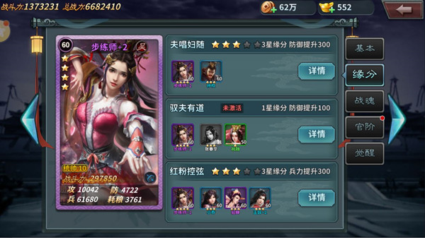 2)缘分。22级解锁,升级来提升对应属性,主要收集不同武将的缘分武将同时提升星级来解锁更好的缘分属性。