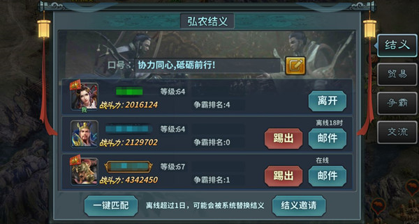 1.结义,可进行匹配、邀请、离开、踢出等操作