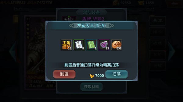 3)武将装备扫荡(剿匪),获取武将装备可提升武将的品质(白色-绿色-蓝色-紫色)解锁武将更多的技能等,剿匪也需要大量的粮食,对粮食的消耗极大,即粮食=主角经验。