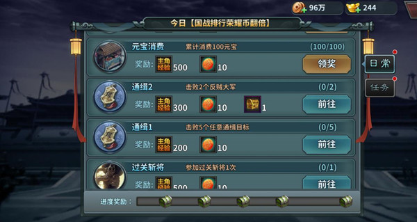1)副本奖励,主要就是名将挑战与密林剿匪。