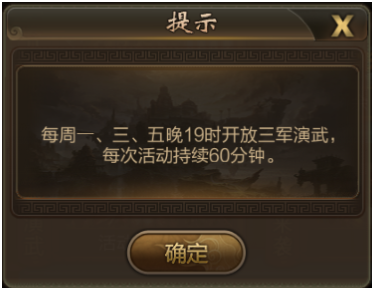 主公60级开启事件——三军演练,每周一、三、五晚上19时开放,每次活动持续60分钟,即20时结束。