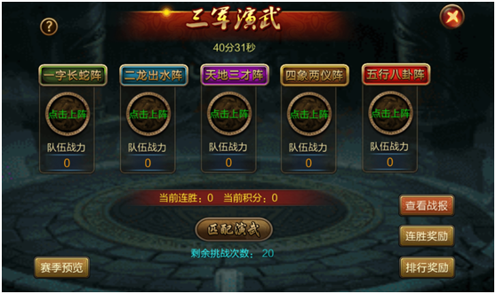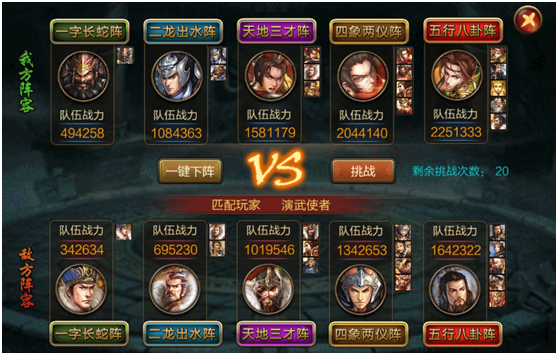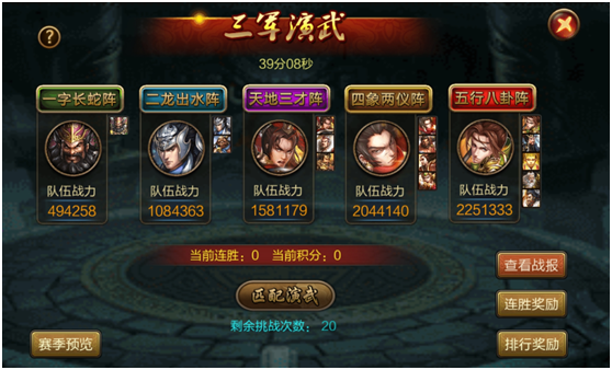 三军演练为5局3胜制,每一场均需上阵不同数量的武将,且武将不可重复上阵,活动时间内每个玩家最多可进行20次挑战。