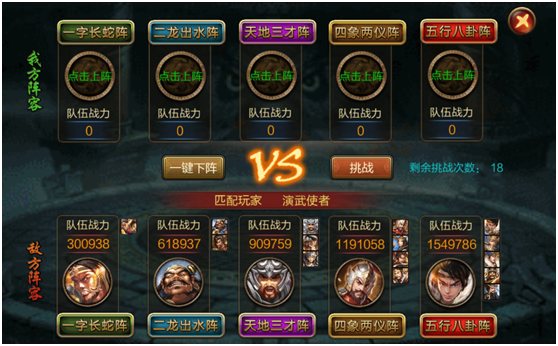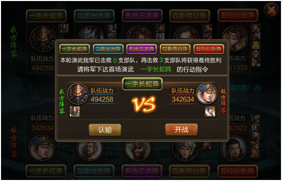 对战前要先确定出战阵型,一共需要设置5个出战阵型,5个阵形可上阵的武将数各不相同,一字长蛇阵必须出战1个武将,二龙出水阵必须出战2个武将、天地三才阵必须出战3个武将、四象两仪阵必须出战4个武将、五行八卦阵必须出战5个武将。