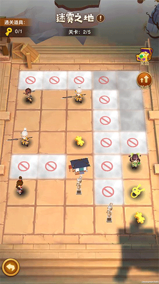 通关规则:迷雾境地共设为5个关卡。每轮关卡共有35个格子,每个格子都会触发随机事件,通过探索翻开迷雾格子找到到通关钥匙,即可通往下一关卡。最后有一个关卡为BOSS关,需打败BOSS才能成功通关。