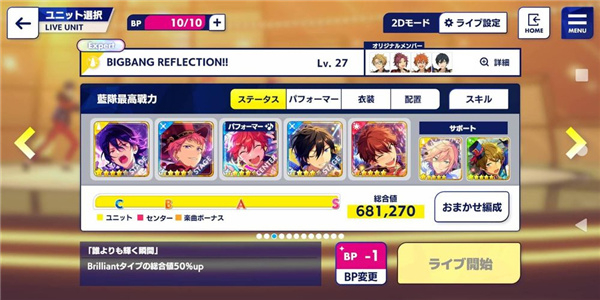 这个是与歌曲不同色的队伍配法,总战力为:681270