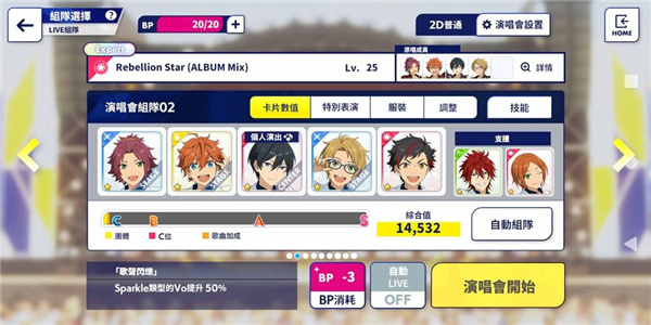 所以资源的分配尤其重要,优先把素材投入5星角,将分数冲高,然后继续打歌获得素材( •̀ ω •́ )✧