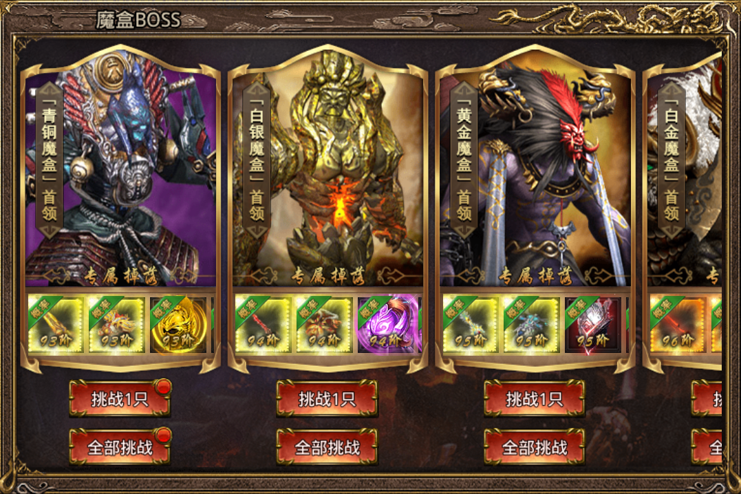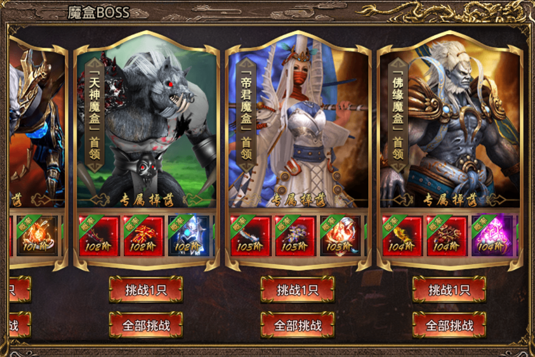 通过消耗指定品阶魔盒可以挑战对应魔盒首领,品级越高可以挑战的首领也越高,当然奖励也就越丰富。