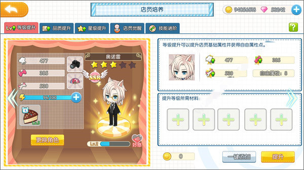等级提升:提升等级可以用经验书也可以吃其他店员来升级(好残酷的喵星人世界)……可以手动挑选材料也可以交给系统君一键添加。这里要说一下,只有珍贵度在R以下的路人店员也就是N级店员会被一键添加,所以店长们不用担心自己心水的小哥哥会遭遇被吃掉的命运了。(什么?你说喜欢N级的?!emmm……)