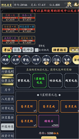 开局攒仙玉去限时特惠里先买橙装,双卡(月卡和永久卡)玩家可以之后去买紫色仙魂。其中功法也是必买的,因为功法是给全员加的。注意橙装可以先留给你队伍里的主输出(例如后面提到的柯渐离或者剑玄)