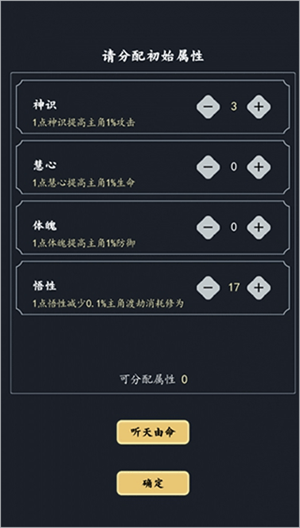 初始属性,个人觉得可以全点悟性,前面三项属性在游戏中很容易提升,而后期渡劫消耗修为会很厉害。