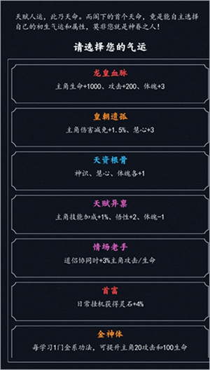 气运选择,尽量选带伤害减免和伤害加深的选项,但特殊效果也可以视情况而定,稀有度品质方面红色>橙色>紫色>蓝色,但不要拘泥于品质,总之优先减免和加深,然后配合一些稀有品质的项目。没有好选项记得刷新,实在不行可以重开。
