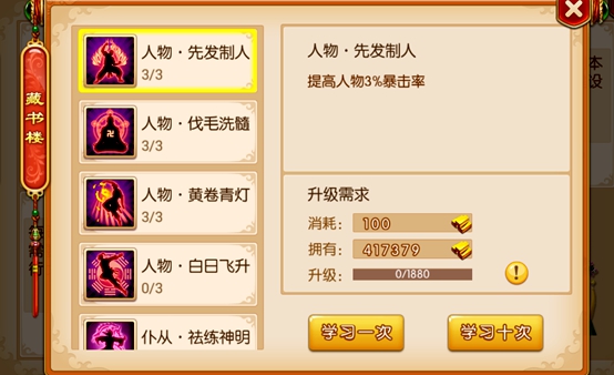 派系科技学习,在藏书楼内使用对应的金砖数量即可学习到想要的派系科技。学习派系科技可以提高人物、仆从、皇子各项属性,派系科技等级是由派系等级决定的,派系科技升级需要消耗金砖。