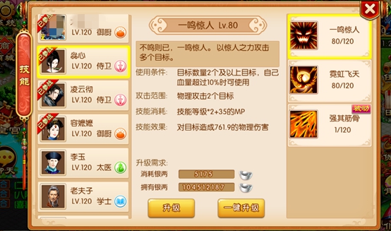 支持画师、学士、太医、御厨、侍卫多种职业,每个职业都有不同的技能,这些技能可以通过消耗银两来升级。