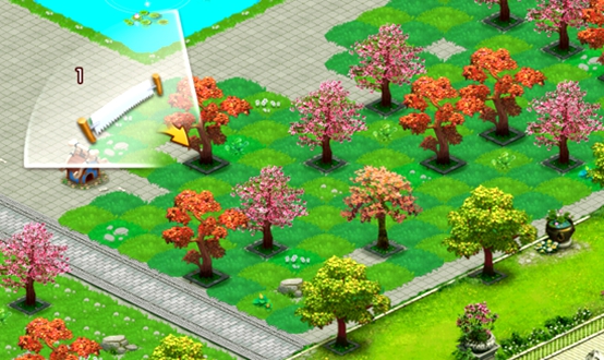点击树木就会出现“锯子”道具,把锯子拉到树下就会自动砍树。