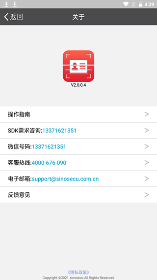 支持拨打电话联系客服,编辑信息提交反馈意见;中安身份证识别app使用说明