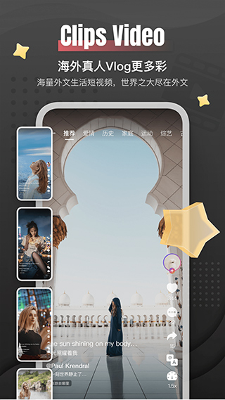 这是一款结合了英语社交和英语短视频的综合性娱乐学习软件。它为用户提供了大量的优质短视频,所有内容均以英文形式呈现,使您能够在观看这些短视频时轻松学习相关的英语词汇。