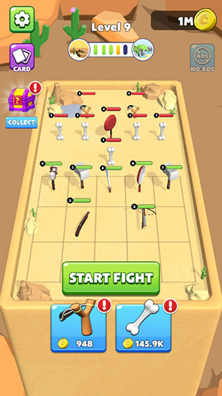摆放完成后即可点击开始战斗。游戏以关卡合成为核心玩法,我们需要赚取更多金币以购买更多武器。