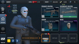 - 强化你的角色——打造你专属的无情银行劫匪!想成为杀手小丑?想加入特种部队?还是想成为恶棍匪徒?赢取成套面具、防弹背心和酷炫服装。高清的3D画面和身临其境的情节设计,让这款第三人称射击游戏变成了一场激动人心的枪战!