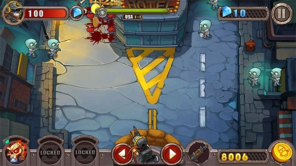 2、游戏开始时的绿头小僵尸是很脆的,一枪爆头,拿起你的武器将它们打成肉酱吧,游戏得高分的一个关键就是你的连续击杀combo数了,不到危急时刻,就用你的机枪一直扫吧,爆炸效果最后再用游戏越到后面僵尸就越难打了,这就需要你切换武器了。