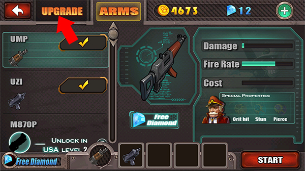 进入横扫僵尸中文最新版游戏后,在升级按钮后边,还有一个枪械按钮,这里就是横扫僵尸的枪支系统;