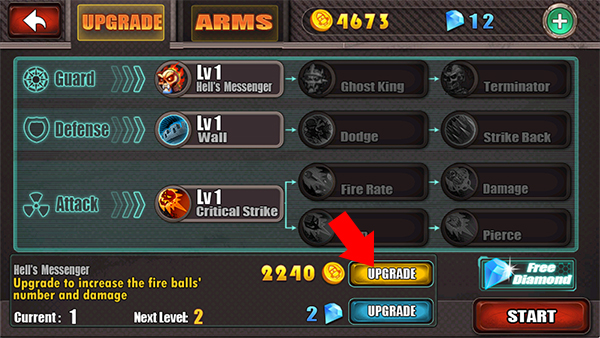 2、接着选择我们想要升级的技能,并在下方选择使用金币或者钻石升级中的一种后方的Upgrade即可