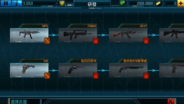 在执行任务的过程中我们有一定的几率可以捡到科技点以及金钱。金钱是用来购买直升机、队员以及武器的。升级武器就需要使用到科技点了。当现在的武器升级满之后,你就可以解锁下一把武器了。当然玩家也可以使用金钱购买装备包裹以及其他型号的直升机还有超级战士。