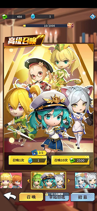 通关1-10后将会解锁酒馆,在酒馆中选择对应的召唤池即可招募慕名而来的英雄们,首次单抽必定获取一名SSR英雄!在团长大人通关3-20后,更是会获得一张幸运自选券,任意30次十连抽,抽到你满意为止。整个召唤池共分为“高级召唤”、“种族召唤”、“友情召唤”三种。