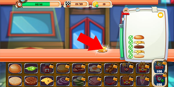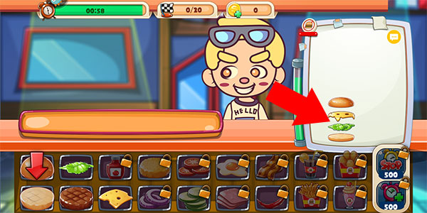 操作非常容易,只需根据右侧屏幕上的指示,依次点击下方的材料就能完成汉堡的制作。
