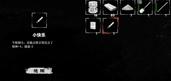 1、烟头:探索翻垃圾或者击败敌人获得,使用后可以获得精神点,但会减少健康值。