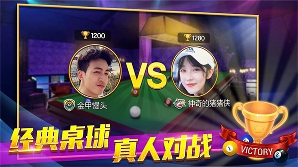 PVP真人实时匹配、8人联赛随机分组,还原现实桌球玩法,简单流畅的操作,酷炫的动画特效给你绝佳的游戏体验。