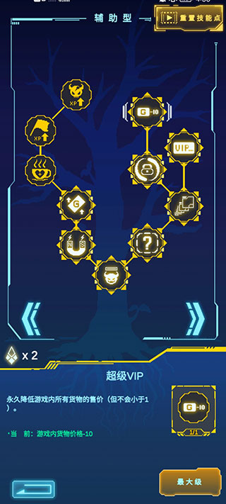 然后把辅助型右边的两个VIP升级,这样方便第一关就白嫖到核心武器。