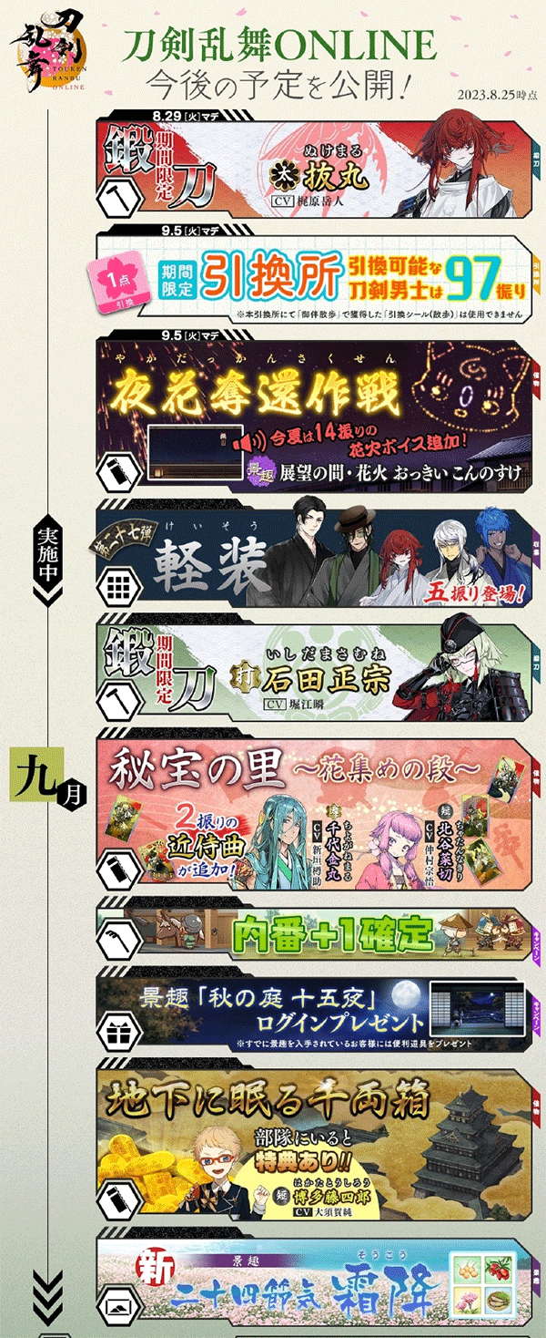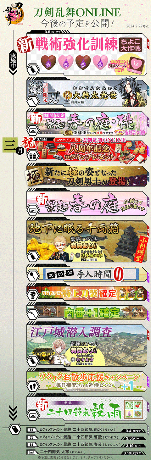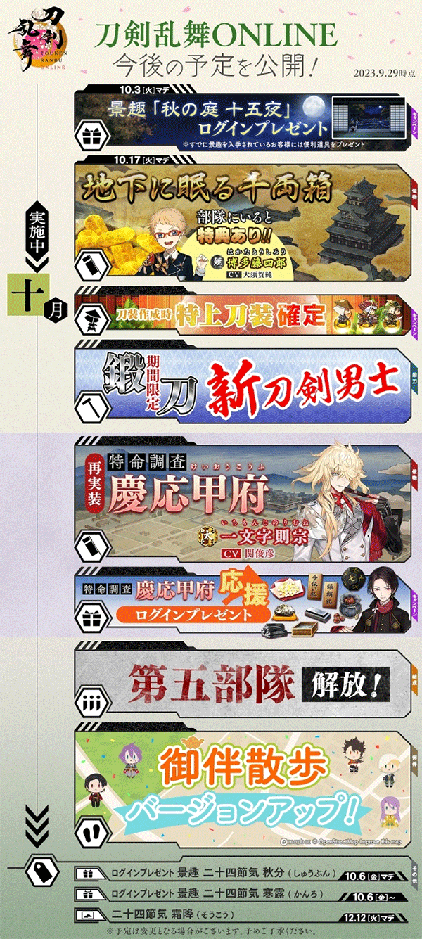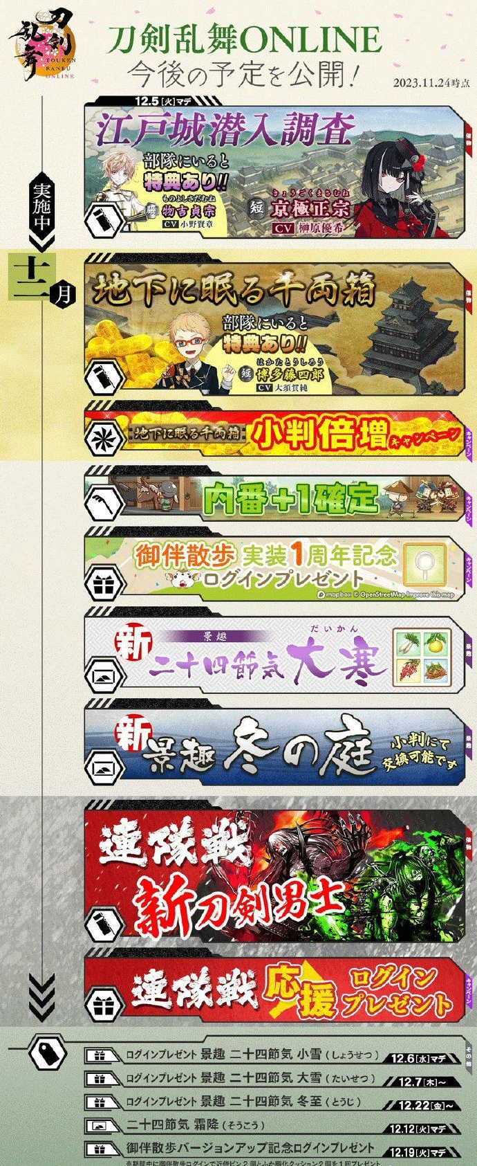 与时间逆行军的战斗、在本丸的生活等,刀剑丹师的生活被描绘成各种情景。