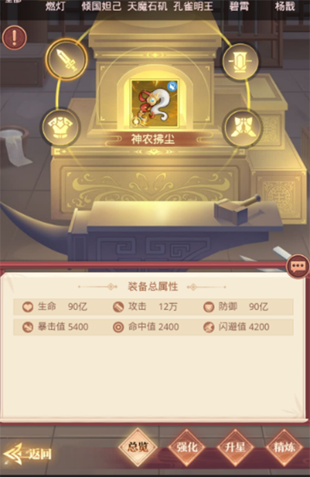 神将法器:每个SSR以上神将都有一件对应的专属法器,强化法器可以带来各项属性的提升以及技能效果的变化,法器并不捆绑升级,每个法器都可让不同的神将来使用,但专属法器搭配对应的神将可以激活专属技能,法器可以通过强化来升阶,法器品阶越高则其专属技能效果越强,附加属性也越多。
