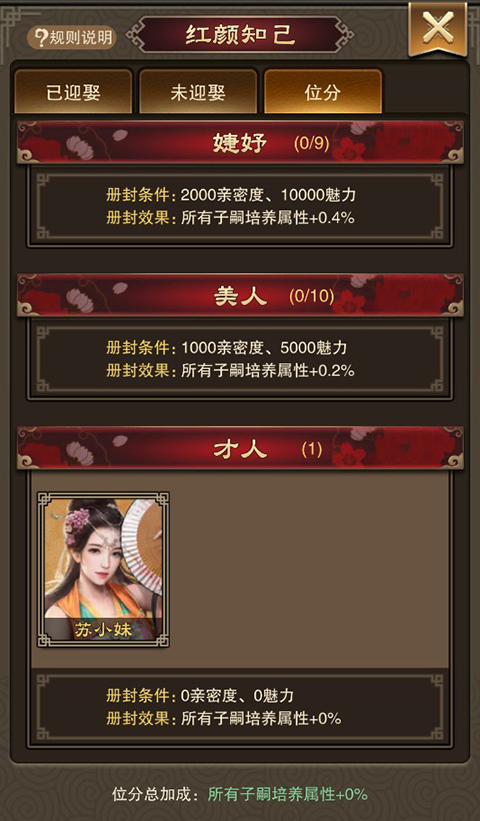 游戏中的人物即为后宫成员,每位成员的地位各不相同,玩家在达到一定的影响力和亲密度后可以提升她们的地位。