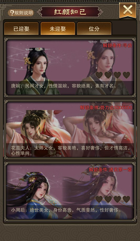 (3)势力达到50000获得花蕊夫人势力达到200000获得鱼玄机,势力达到500000获得李清照,势力达到1000000获得武媚娘