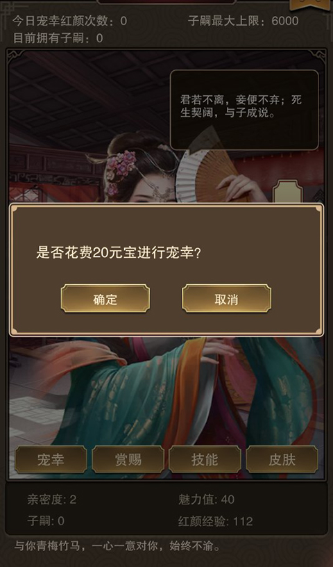 玩家可以通过宠幸以及赏赐的方式来增加和红颜的亲密度,亲密度达到一定程度后红颜后可以为玩家诞下子嗣。