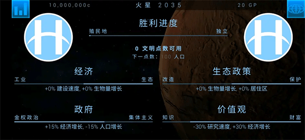 地球化您的星球,更改每个世界的特定属性,支持人类生活,这包括气压、氧气、海平面和生物质;