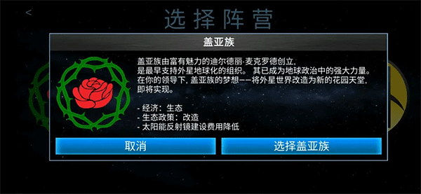 盖亚族主要是使生物量增长,这在前期我觉得没有任何作用,在后期也仅仅是使我们要改造的星球更快地变绿而已。我不是很推荐选这个阵营。