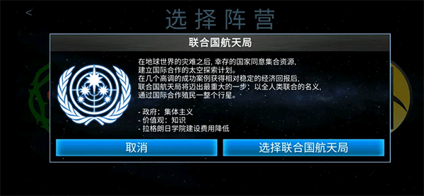加入四个星际区之一,每个区对殖民都有不同好处;