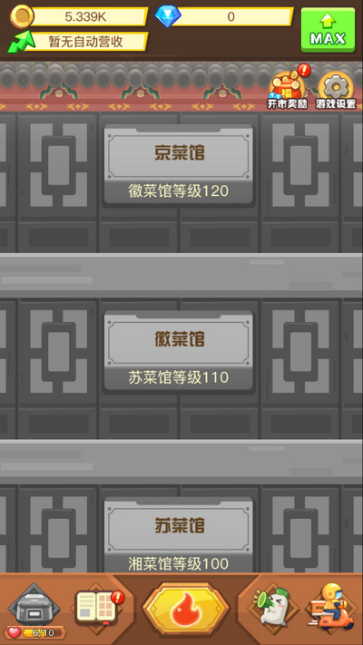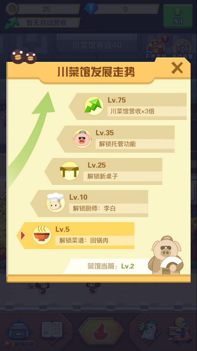5、一切的玩法都是建立在玩家赚钱、升级饭馆之后才能解锁,玩的越久等级越高,等级越高赚钱方式就越多!