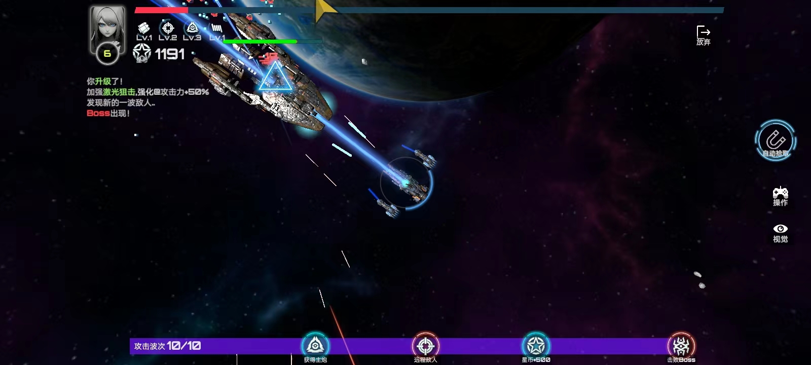 3、一共有十波敌人,玩家全部击败之后,即可成功;进入游戏后,战舰会自动识别敌军进行射击;