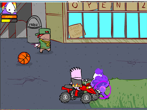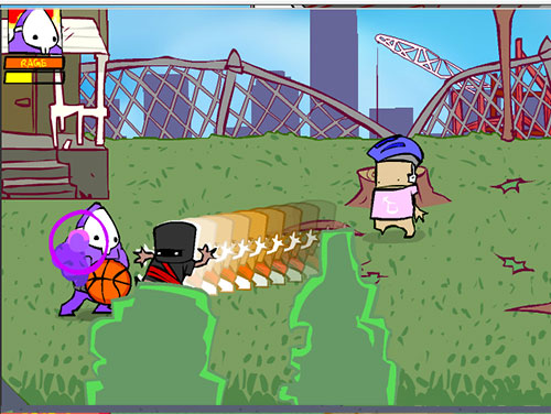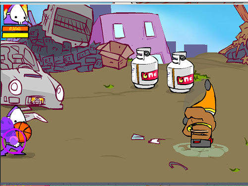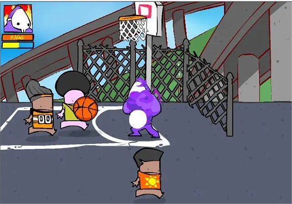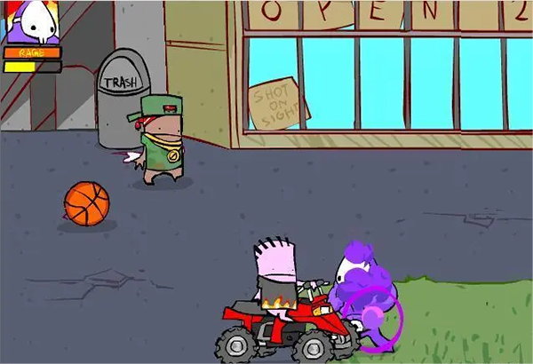 有两个小孩开着车来了!被车撞到会伤血!可以用篮球打爆或用上面的垃圾桶,还可以用风车拳!提示:狂扁那个垃圾桶会增加爆气率。