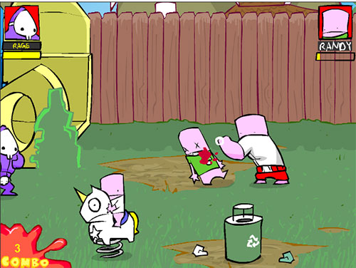 到了幼儿园,见一幼儿园老师也在“狂扁小朋友”,还打死了一个。 这家伙便是第一个BOSS,血量和玩家相当,建议用风车拳或拳脚大连环,打死为止。幼儿园内有三个油桶可当炸药使,还有个绿色垃圾桶,狂扁它可以增加爆气率。 提示:有个小孩骑的木马是会随机变化的。