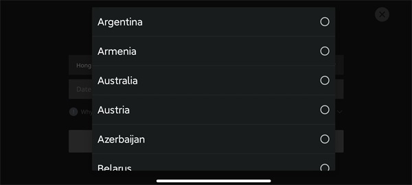 2、选择国家地区,本次测试仅供25个国家/地区(上文中有提及具体国家/地区)